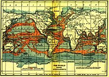 Humans first acquired knowledge of the waves and currents of the seas and oceans in pre-historic times. Observations on tides are recorded by Aristotle and Strabo. Early modern exploration of the oceans was primarily for cartography and mainly limited to its surfaces and of the creatures that fishermen brought up in nets, though depth soundings by lead line were taken. Although Juan Ponce de León in 1513 first identified the Gulf Stream, and the current was well-known to mariners, Benjamin Franklin made the first scientific study of it and gave it its name. Franklin measured water temperatures during several Atlantic crossings and correctly explained the Gulf Stream's cause. Franklin and Timothy Folger printed the first map of the Gulf Stream in 1769-1770.[1][2] When Louis Antoine de Bougainville, who voyaged between 1766 and 1769, and James Cook, who voyaged from 1768 to 1779, carried out their explorations in the South Pacific, information on the oceans themselves formed part of the reports. James Rennell wrote the first scientific textbooks about currents in the Atlantic and Indian oceans during the late 18th and at the beginning of 19th century. Sir James Clark Ross took the first modern sounding in deep sea in 1840, and Charles Darwin published a paper on reefs and the formation of atolls as a result of the second voyage of HMS Beagle in 1831-6. Robert FitzRoy published a report in four volumes of the three voyages of the Beagle. In 1841–1842 Edward Forbes undertook dredging in the Aegean Sea that founded marine ecology. As first superintendent of the United States Naval Observatory (1842–1861) Matthew Fontaine Maury devoted his time to the study of marine meteorology, navigation, and charting prevailing winds and currents. His Physical Geography of the Sea, 1855 was the first textbook of oceanography. Many nations sent oceanographic observations to Maury at the Naval Observatory, where he and his colleagues evaluated the information and gave the results worldwide distribution.[3] The steep slope beyond the continental shelves was discovered in 1849. The first successful laying of transatlantic telegraph cable in August 1858 confirmed the presence of an underwater "telegraphic plateau" mid-ocean ridge. After the middle of the 19th century, scientific societies were processing a flood of new terrestrial botanical and zoological information. In 1871, under the recommendations of the Royal Society of London, the British government sponsored an expedition to explore world's oceans and conduct scientific investigations. Under that sponsorship the Scots Charles Wyville Thompson and Sir John Murray launched the Challenger expedition (1872–1876). The results of this were published in 50 volumes covering biological, physical and geological aspects. 4417 new species were discovered. Other European and American nations also sent out scientific expeditions (as did private individuals and institutions). The first purpose built oceanographic ship, the "Albatros" was built in 1882. The four-month 1910 North Atlantic expedition headed by Sir John Murray and Johan Hjort was at that time the most ambitious research oceanographic and marine zoological project ever, and led to the classic 1912 book The Depths of the Ocean. Oceanographic institutes dedicated to the study of oceanography were founded. In the United States, these included the Scripps Institution of Oceanography in 1892, Woods Hole Oceanographic Institution in 1930, Virginia Institute of Marine Science in 1938, Lamont-Doherty Earth Observatory at Columbia University, and the School of Oceanography at University of Washington. In Britain, there is a major research institution: National Oceanography Centre, Southampton which is the successor to the Institute of Oceanography. In Australia, CSIRO Marine and Atmospheric Research, known as CMAR, is a leading center. In 1921 the International Hydrographic Bureau (IHB) was formed in Monaco. In 1893, Fridtjof Nansen allowed his ship "Fram" to be frozen in the Arctic ice. As a result he was able to obtain oceanographic data as well as meteorological and astronomical data. The first international organization of oceanography was created in 1902 as the International Council for the Exploration of the Sea. The first acoustic measurement of sea depth was made in 1914. Between 1925 and 1927 the "Meteor" expedition gathered 70,000 ocean depth measurements using an echo sounder, surveying the Mid atlantic ridge. The Great Global Rift, running along the Mid Atlantic Ridge, was discovered by Maurice Ewing and Bruce Heezen in 1953 while the mountain range under the Arctic was found in 1954 by the Arctic Institute of the USSR. The theory of seafloor spreading was developed in 1960 by Harry Hammond Hess. The Ocean Drilling Project started in 1966. Deep sea vents were discovered in 1977 by John Corlis and Robert Ballard in the submersible "Alvin". In the 1950s, Auguste Piccard invented the bathyscaphe and used the "Trieste" to investigate the ocean's depths. The nuclear submarine Nautilus made the first journey under the ice to the North Pole in 1958. In 1962 there was the first deployment of FLIP (Floating Instrument Platform), a 355 foot spar buoy. Then, in 1966, the U.S. Congress created a National Council for Marine Resources and Engineering Development. NOAA was put in charge of exploring and studying all aspects of Oceanography in the USA. It also enabled the National Science Foundation to award Sea Grant College funding to multi-disciplinary researchers in the field of oceanography.[4] From the 1970s, there has been much emphasis on the application of large scale computers to oceanography to allow numerical predictions of ocean conditions and as a part of overall environmental change prediction. An oceanographic buoy array was established in the Pacific to allow prediction of El Niño events. 1990 saw the start of the World Ocean Circulation Experiment (WOCE) which continued until 2002. Geosat seaf