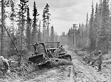 The attack on Pearl Harbor and beginning of the Pacific Theatre in World War II, coupled with Japanese threats to the west coast of North America and the Aleutian Islands, changed the priorities for both nations. On February 6, 1942 the construction of the Alaska Highway was approved by the United States Army and the project received the authorization from the U.S. Congress and President Franklin D. Roosevelt to proceed five days later. Canada agreed to allow construction as long as the United States bore the full cost, and that the road and other facilities in Canada be turned over to Canadian authority after the war ended. The official start of construction took place on March 8, 1942 after hundreds of pieces of construction equipment were moved on priority trains by the Northern Alberta Railways to the northeastern part of British Columbia near Mile 0 at Dawson Creek. Construction accelerated through the spring as the winter weather faded away and crews were able to work from both the northern and southern ends; they were spurred on after reports of the Japanese invasion of Kiska Island and Attu Island in the Aleutians. On September 24, 1942 crews from both directions met at Mile 588 at what became named Contact Creek,[2] at the British Columbia-Yukon border at the 60th Parallel; the entire route was completed October 28, 1942 with the northern linkup at Mile 1202, Beaver Creek, and the highway was dedicated on November 20, 1942 at Soldiers Summit. The needs of war dictated the final route, intended to link the airfields of the Northwest Staging Route that conveyed lend-lease aircraft from the United States to the Soviet Union. Thus, the rather impractical, long route over extremely difficult terrain was chosen. The road was originally built mostly by the US Army as a supply route during World War II. There were four main thrusts in building the route: southeast from Delta Junction, Alaska toward a linkup at Beaver Creek, Yukon; north then west from Dawson Creek (an advance group started from Fort Nelson, British Columbia after traveling on winter roads on frozen marshland from railway stations on the Northern Alberta Railways); both east and west from Whitehorse after being ferried in via the White Pass and Yukon Route railway. The U.S. Army commandeered equipment of all kinds, including local riverboats, railway locomotives, and housing originally meant for use in southern California. Although it was completed on October 28, 1942 and its completion was celebrated at Soldier's Summit on November 21 (and broadcast by radio, the exact outdoor temperature censored due to wartime concerns), the "highway" was not usable by general vehicles until 1943. Even then, there were many steep grades, a poor surface, switchbacks to gain and descend hills, and few or no guardrails. Bridges, which progressed during 1942 from pontoon bridges to temporary log bridges, were replaced with steel bridges where necessary only. A replica log bridge, the Canyon Creek bridge, can be seen at the Aishihik river crossing; the bridge was rebuilt in 1987 and refurbished in 2005 by the Yukon government as it is a popular tourist attraction. The easing of the Japanese invasion threat resulted in no more contracts being given to private contractors for upgrading of specific sections. |
