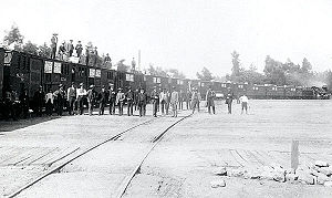 he early Forty-Niners of the California Gold Rush wishing to come to California were faced with limited options. From the East Coast, for example, a sailing voyage around the tip of South America would take five to eight months,[1] and cover some 18,000 nautical miles (33,000 km). An alternative route was to sail to the Atlantic side of the Isthmus of Panama, to take canoes and mules for a week through the jungle, and then on the Pacific side, to wait for a ship sailing for San Francisco.[2] Eventually, most gold-seekers took the overland route across the continental United States, particularly along the California Trail.[3] Each of these routes had its own deadly hazards, from shipwreck to typhoid fever to cholera or Indian attack.[4][5] [edit] Transcontinental linksThe very first "inter-oceanic" railroad which affected California was built in 1855 across the Isthmus of Panama, the Panama Railway.[6] The Panama Railway reduced the time needed to cross the Isthmus from a week of difficult and dangerous travel to a day of relative comfort. The building of the Panama Railroad, in combination with the increasing use of steamships (instead of sailing ships) meant that travel to and from California via Panama was the primary method used by people who could afford to do so, and was used for valuable cargo, such as the gold being shipped from California to the East Coast.[7] California's symbolic and tangible connection to the rest of the country was fused at Promontory Summit, Utah, as the last spike was driven to join the tracks of the Central Pacific and Union Pacific Railroads, thereby completing the First Transcontinental Railroad on May 10, 1869 (before that time, only a few local rail lines operated in the State, the first being the Sacramento Valley Railroad).[8] The 1,600 mile (2,575-kilometer) from Omaha, Nebraska would now take mere days. The Wild West was quickly transformed from a lawless, agrarian frontier to what would become an urbanized, industrialized economic and political powerhouse. Of perhaps greater significance is the unbridled economic growth that was spurred on by the sheer diversity of opportunities available in the region. The four years following the Golden Spike ceremony saw the length of track in the U.S. double to over 70,000 miles (nearly 113,000 kilometers).[9] By the turn of the century, the completion of four subsequent transcontinental routes in the United States and one in Canada would provide not only additional pathways to the Pacific Ocean, but would forge ties to all of the economically-important areas between the coasts as well. Virtually the entire country was accessible by rail, making a national economy possible for the first time. And while federal financial assistance (in the form of land grants and guaranteed low-interest loans, a well-established government policy) was vital to the railroads’ expansion across North America, this support accounted for less than eight percent (8%) of the total length of rails laid; private investment was responsible for the vast majority of railroad construction.[10] As rail lines pushed further and further into the wilderness, they opened up huge areas which would have otherwise lain fallow. The railroads helped establish countless towns and settlements, paved the way to abundant mineral deposits and fertile tracts of pastures and farmland, and created new markets for eastern goods. It is estimated that by the end of World War II, rail companies nationwide remunerated to the government over $1 billion dollars, more than eight times the original value of the lands granted.[11] The principal commodity transported across the rails to California was people: by reducing the cross-country travel time to as little as six days, men with westward ambitions were no longer forced to leave their families behind. The railroads would, in time, provide equally-important linkages to move the inhabitants throughout the state, interconnecting its blossoming communities. "Transportation determines the flow of population," declared J. D. Spreckels, one of California's early railroad entrepreneurs, just after the dawn of the twentieth century. "Before you can hope to get people to live anywhere...you must first of all show them that they can get there quickly, comfortably and, above all, cheaply."[12] Among Spreckels' many accomplishments was the formation of the San Diego Electric Railway in 1892, which radiated out from downtown to points north, south, and east and helped urbanize San Diego. Henry Huntington, the nephew of Central Pacific founder Collis P. Huntington, would develop his Pacific Electric Railway in Los Angeles and Orange Counties with much the same result. Spreckels' greatest challenge would be to provide San Diego with its own direct transcontinental rail link in the form of the San Diego and Arizona Railway (completed in November 1919), a feat that nearly cost the sugar heir his life.[13] The Central Pacific Railroad, in effect, initiated the trend by offering settlement incentives in the form of low fares, and by placing sections of its government-granted lands up for sale to pioneers. When the Atchison, Topeka, and Santa Fe Railroad charted its own solo course across the continent in 1885 it chose Los Angeles as its western terminus, and in doing so fractured the Southern Pacific Railroad's near total monopoly on rail transportation within the state. The original purpose of this new line was to augment the route to San Diego, established three years prior as part of a joint venture with the California Southern Railroad, but the Santa Fe would subsequently be forced to all but abandon these inland tracks through the Temecula Canyon (due to constant washouts) and construct its Surf Line along the coast to maintain its exclusive ties to Los Angeles.[14] Santa Fe's entry into Southern California resulted in widespread economic growth and ignited a fervent rate war with the Southern Pacific, or "Espee" as the road w