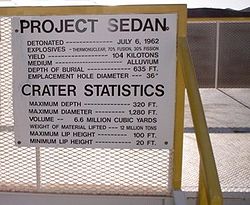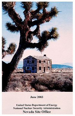 Between 1951 and 1992, there were a total of 928 announced nuclear tests at Nevada Test Site. Of those, 828 were underground.[1] (Sixty-two of the underground tests included multiple, simultaneous nuclear detonations, adding 93 detonations and bringing the total number of NTS nuclear detonations to 1,021, of which 921 were underground.)[2] The site is covered with subsidence craters from the testing. The Nevada Test Site was the primary testing location of American nuclear devices; 126 tests were conducted elsewhere (many at the Pacific Proving Grounds in the Marshall Islands). During the 1950s, the mushroom cloud from these tests could be seen for almost 100 mi (160 km) in either direction, including the city of Las Vegas, where the tests became tourist attractions. Americans headed for Las Vegas to witness the distant mushroom clouds that could be seen from the downtown hotels. On July 17, 1962, the test shot "Little Feller I" of Operation Sunbeam became the last atmospheric test detonation at the Nevada Test Site. Underground testing of weapons continued until September 23, 1992, and although the United States did not ratify the Comprehensive Test Ban Treaty, the articles of the treaty are nevertheless honored and further tests have not occurred. Subcritical testing, tests not involving the full creation of a critical mass, continue. One notable test shot was the "Sedan" shot of Operation Storax on July 6, 1962, a 104 kiloton shot for the Operation Plowshare which sought to prove that nuclear weapons could be used for peaceful means in creating bays or canals—it created a crater 1,280 feet (390 m) wide and 320 feet (100 m) deep that can still be seen today. While most of the larger tests were conducted elsewhere, NTS was home to tests in the 500 kiloton to 1 megaton (2 to 4 petajoule) range, which caused noticeable seismic effects in Las Vegas. [edit] 1992–2007The site was scheduled to be used to conduct the testing of a 1,100-ton conventional explosive in an operation known as Divine Strake in June 2006. The bomb is a possible alternative to nuclear bunker busters.[3] However, after objection from Nevada and Utah members of Congress, the operation was postponed until 2007. On February 22, 2007 the Defense Threat Reduction Agency (DTRA) officially canceled the experiment. [edit] Destruction and Survivability testing NTS also performed "piggyback" testing of effects of nuclear detonation during the above-ground tests. Vehicles, shelters, utility stations, and other structures were placed at various distances from the "Ground Zero" detonation point of each weapon. Homes and commercial buildings were built to standards typical of American and European cities. Other structures included military fortifications (of types used by both NATO and the Warsaw Pact), civil defense, and "backyard" shelters. In a typical test several buildings might be built using the same plan with different types of paint, landscaping, cleanliness of yards, wall angles, or distances from Ground Zero. Mannequins were placed in and around vehicles and buildings. High-speed cameras were placed in protected locations to capture effects of radiation and shock waves. Typical imagery from these cameras shows paint boiling off of the buildings, which then are pushed away from Ground Zero by the shock wave before being drawn toward the detonation by the suction caused by the climbing mushroom cloud. This testing allowed the development of guidelines, distributed to the public, to increase the likelihood of survival in case of air- or spaceborne nuclear attack. [edit] Environmental impactEach of the underground explosions—some as deep as 5,000 feet—vaporized a large chamber, leaving a cavity filled with radioactive rubble. About a third of the tests were conducted directly in aquifers, and others were hundreds or thousands of feet above the water table.[4] When testing ended in 1992, the Energy Department estimated that more than 300 million curies of radiation remained, making the site one of the most radioactively contaminated places in the United States. In the worst affected zones, radioactivity in the tainted water reaches millions of picocuries per liter. (The federal standard for drinking water is 20 picocuries per liter.) Although radiation levels in the water have declined over time, the longer-lived isotopes will continue to pose risks for tens of thousands of years.[4] The Energy Department has 48 monitoring wells at the site and recently began drilling nine deep wells. Because the contaminated water poses no immediate health threat, the Department has ranked Nevada as a low priority for cleaning up major nuclear weapons sites, and it operates far fewer wells than at most other contaminated sites.[4] [edit] Protests and demonstrationsFrom 1986 through 1994, two years after the United States put a hold on full-scale nuclear weapons testing, 536 demonstrations were held at the Nevada Test Site involving 37,488 participants and 15,740 arrests, according to government records.[5] American Peace Test (APT) and Nevada Desert Experience (NDE) held most of these.[6] In March 1988, APT held an event where more than 8,000 people attended a ten-day action to "Reclaim the Test Site", where nearly 3,000 people were arrested with more than 1,200 in one day. This set a record for most civil disobedience arrests in a single protest. American Peace Test was collectively run by a group of individuals residing in Las Vegas, but leadership for the group was national. It originated with a small group of people who were active in the National Nuclear Weapons Freeze. APT was a breakaway organization beginning in 1986, with first public events held in 1987. In the years that followed 1994, Shundahai Network in cooperation with Nevada Desert Experience and Corbin Harney continued the protests of the government's continued nuclear weapons work and also staged efforts to stop a repository for highly radioactive waste adjacent to th